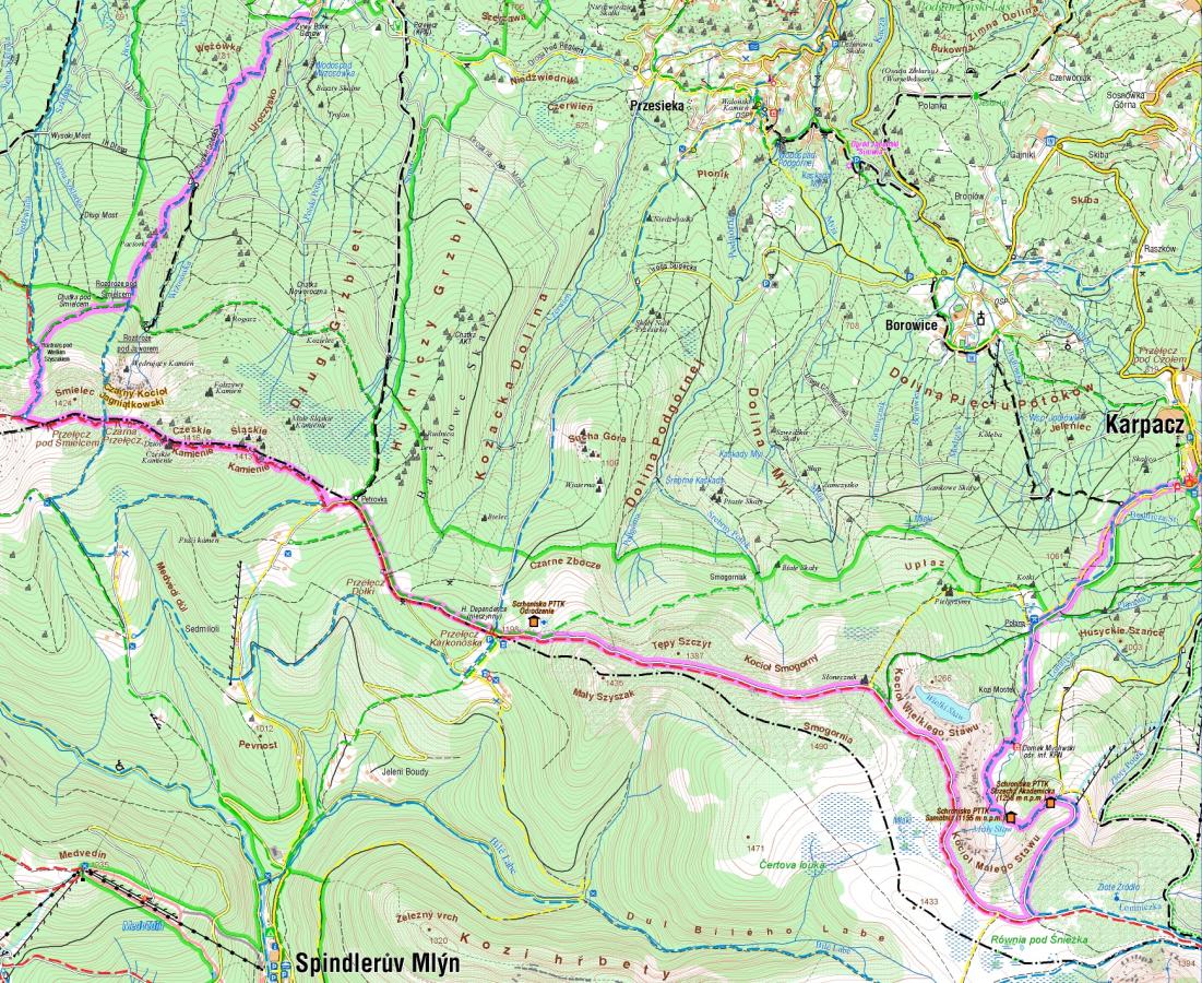 Droga wiedzie na styku granic, więc co chwilę słyszymy czeski język. Naszych sąsiadów jest tu znacznie więcej niż Polaków. Na szczęście tłumów nie ma aż do Przełęczy Karkonoskiej, gdzie liczba turystów na metr kwadratowy znacznie się zwiększa. A wszystko za sprawą naszych południowych sąsiadów. Już wcześniej słyszałam od znajomych o wielkim wybetonowanym parkingu gdzie czeskie grupy tłumnie wysypują się z autokarów, o kortach tenisowych i wielkim jak na górskie warunki hotelu. Myślałam jednak, że to opis którejś z powieści Lema. Niestety, iście lemowska wizja okazała się prawdą - i Czesi, i autobusy, i wielki hotel, i korty także. A do tego asfaltowa droga ze Szpindlerowego Młyna. Co więcej, kilka lat temu odbywały się negocjacje, aby połączyć tę drogę z polską Przesieką lub zbudować tunel między miejscowościami. Na szczęście pomysł upadł.