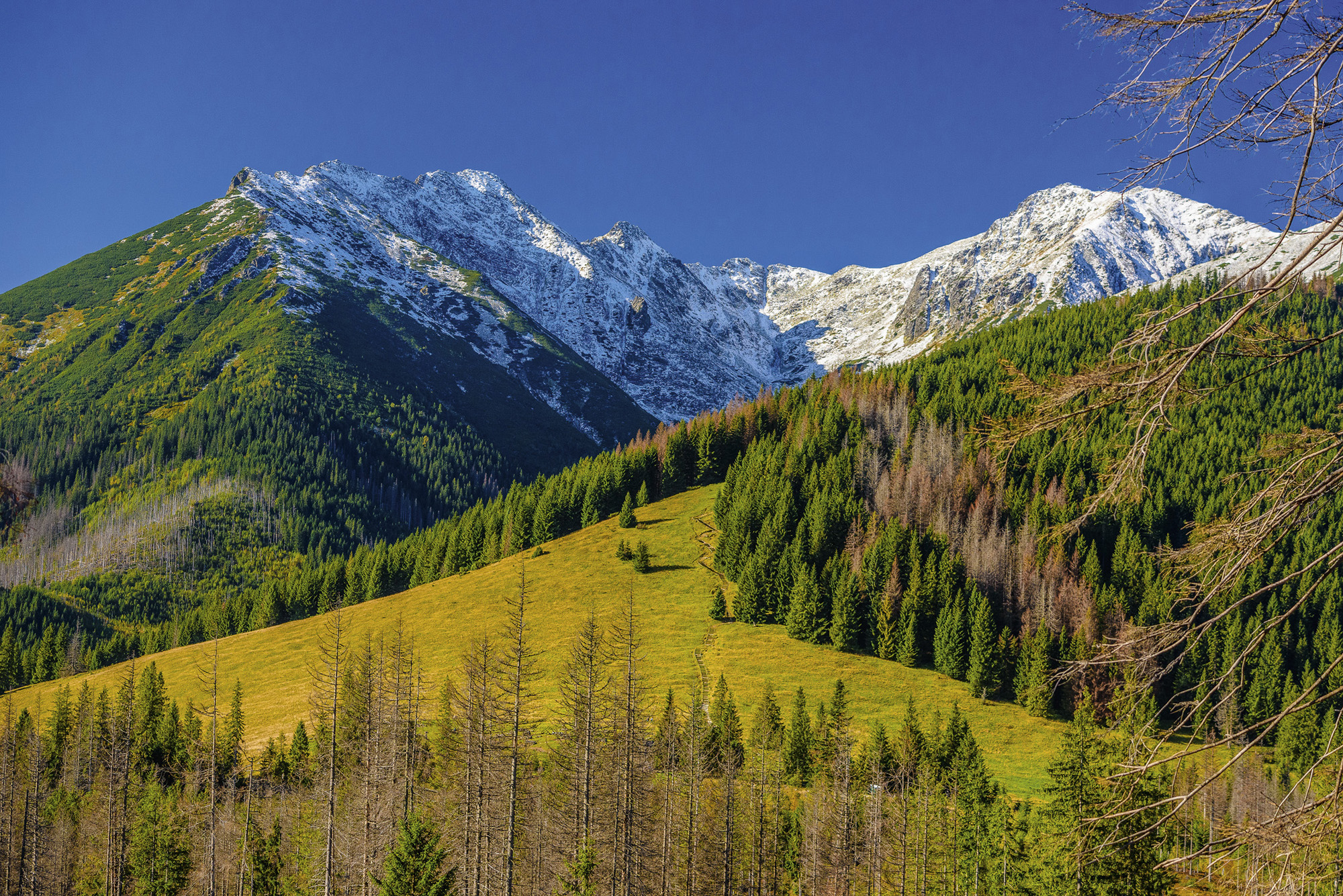 A może by tak jednak trochę zwolnić? Zamiast bić rekordy na grani, zaliczać kilometry i szczyty, pójść z książką na wielką polanę, by na kilka godzin odciąć się od świata z widokiem na najpiękniejsze tatrzańskie granie? Mam takie dwa ulubione miejsca, które nadają się do tego idealnie. Absolutny numer jeden to Szeroka Przełęcz (słow. Široké sedlo, 1826 m n.p.m.) w Tatrach Bielskich. Idziemy najpierw lasem, potem łąką, aż nagle ukazuje nam się niesamowity widok, przypominający niemal fototapetę. Od Jagnięcego Szczytu i innych znanych szczytów, dzieli nas tylko Dolina Zadnich Koperszadów. Wszystko mamy niemal na wyciągnięcie ręki.