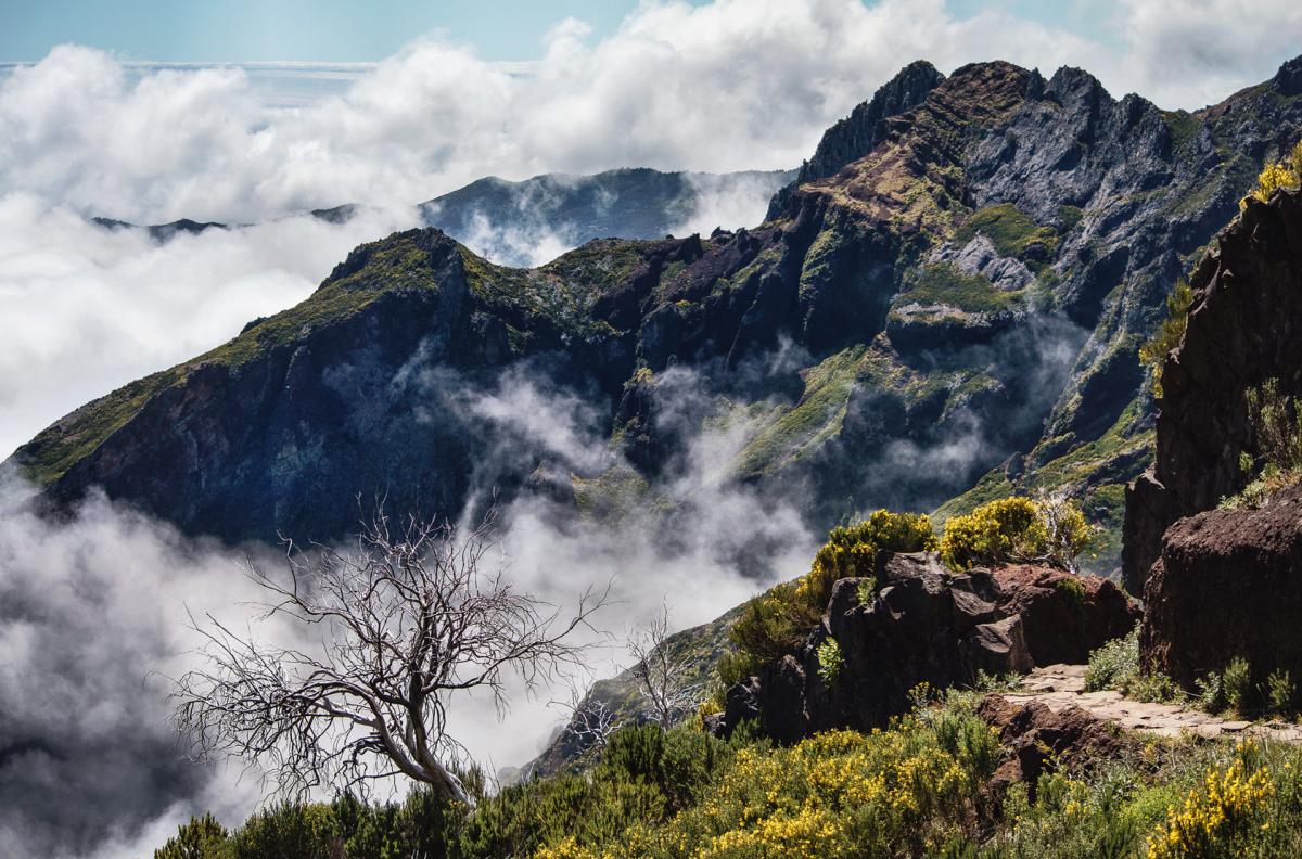 Schodzimy tą samą drogą do schroniska i tu, na rozwidleniu dróg skręcamy w stronę Pico do Arieiro (1818 m n.p.m.). To najpopularniejszy i najpiękniejszy szlak na wyspie oznaczony jako PR1, liczy niewiele ponad 5 km. Początkowo droga prowadzi w dół. Wokół otaczają nas krzewy kwitnącego na żółto żarnowca i niezliczona ilość roślin, których nazw nie potrafię wymienić. Kontrast do bujnej zieleni stanowią gołe kikuty drzew, które są wspomnieniem tragedii, jaka dotknęła wyspę pięć lat temu. Wielki pożar strawił wtedy roślinność porastającą zbocza. Dziś natura odradza się ze zdwojoną siłą, choć suche pnie wrzośca drzewiastego wprowadzają nieco mroczny klimat.