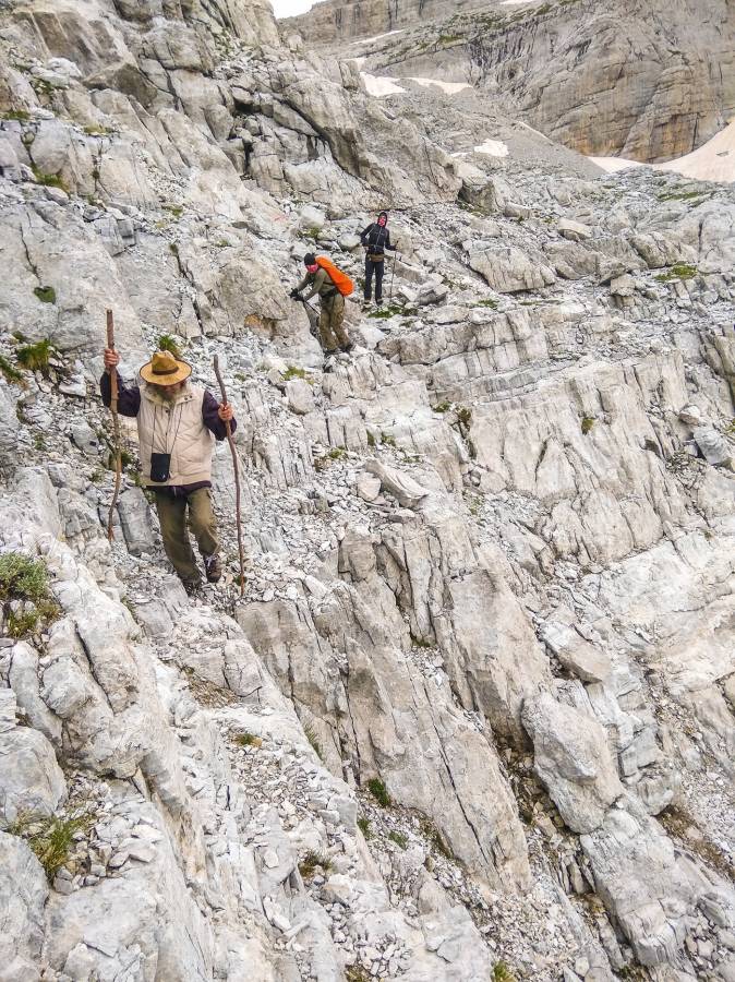 Zza kolejnego załomu skalnego dostrzegamy krzyż na wierzchołku Maja e Jezercës. Mapa nie pomaga, bo szlak nakreślony był umownie. Szukamy więc drogi intuicyjnie. Ścieżka przemyka teraz rozmaitymi wariantami przez półki skalne, zachody i strome piargi opadające do kotlinki, aż wyprowadza na grube i rozległe pole firnowe, po którym podchodzimy do przepaścistej grani na zwornikowy wierzchołek (2500 m n.p.m.). Stąd roztacza się panorama na wszystkie strony świata, w tym na szczyt Maja e Jezercës. A z tyłu, kilkaset metrów niżej, dostrzegamy miejsce naszego biwaku.
