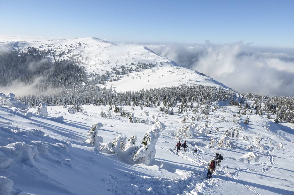 Gruba warstwa śniegu zakrywa choinki, zmieniając je w śnieżno-lodowe bałwany, które ledwo wyróżniają się od bieli otoczenia. Nic dziwnego, że aparat fotograficzny zaczyna wariować z braku kontrastu. Na szczęście wystarczy przejść kilka metrów, by dostrzec fragmenty błękitu nieba powyżej warstwy chmur. Ruszam więc dalej czerwonym szlakiem w śnieżny labirynt.