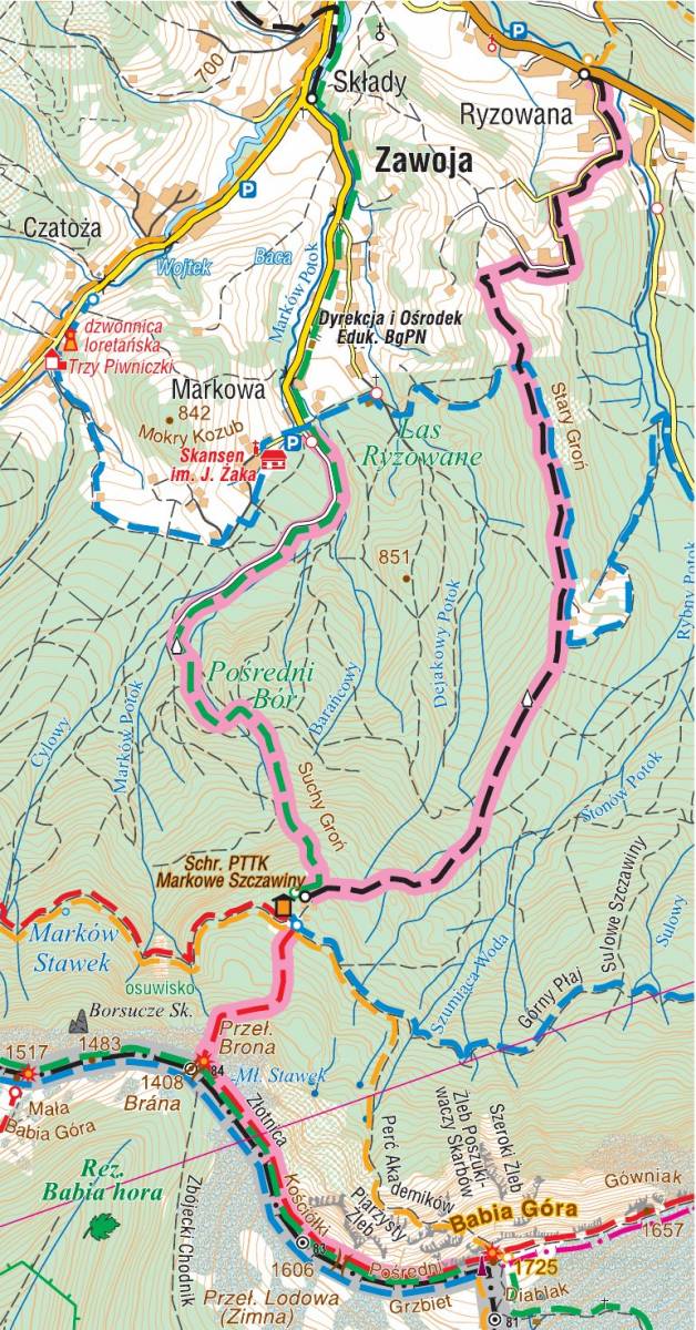 zielony: Zawoja Markowa – Markowe Szczawiny 1h 45 min ↑ 1 h 15 min ↓