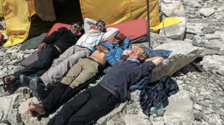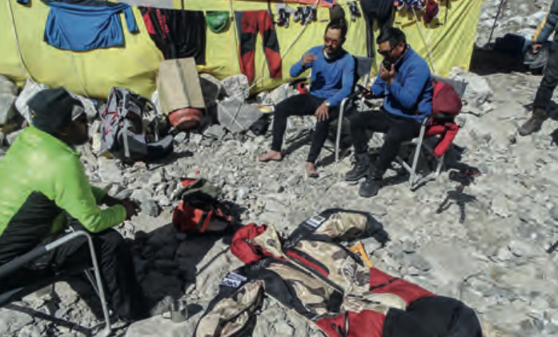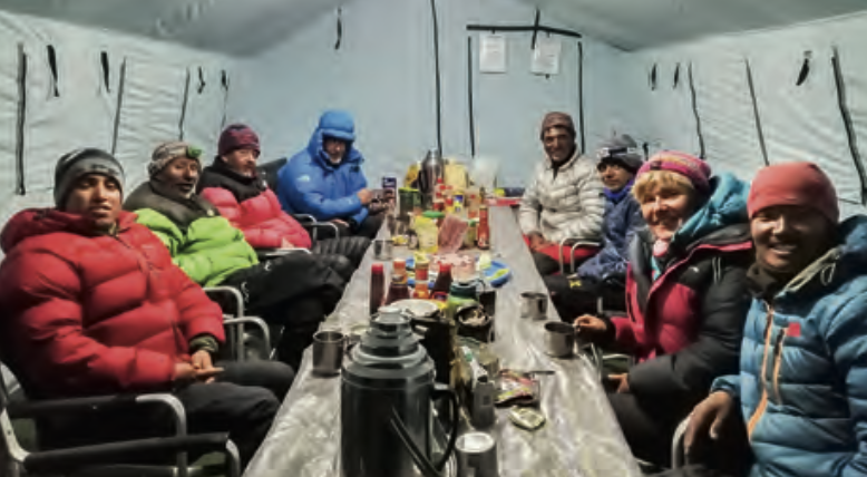Śniadanie urozmaicają rozmowy i żarty. Ekipę mamy międzynarodową. Są Amerykanie, Brytyjczycy, Hiszpanie, Irlandczycy, Chilijczyk, Hindusi, Brazylijczyk i dziewczyna z Botswany (dwa tygodnie później przyzna, że to jednak nie jej bajka, zimna nie polubi i wraca do Afryki). To nic że się wcześniej nie znaliśmy. Przyjaźnie zawarte w górach utrzymują się długo, także w dolinach. Jest beztrosko i wesoło, gadamy o naszej górskiej pasji. W najczarniejszym scenariuszu do głowy nam nie przyjdzie, że dwie osoby z tego grona z ataku szczytowego nie wrócą.