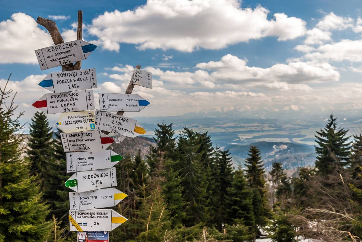 Drogowskazy z widokiem na Tatry przy schronisku pod Turbaczem, zdjęcie Adobe Stock