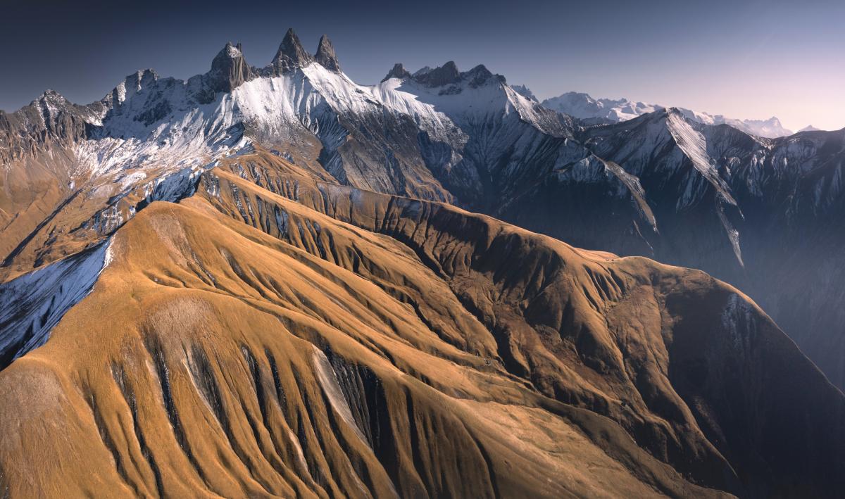 Aiguilles d’Arves – trzy skalne iglice Alp Francuskich widziane od strony Col de la Croix de Fer i jeziora Guichard.