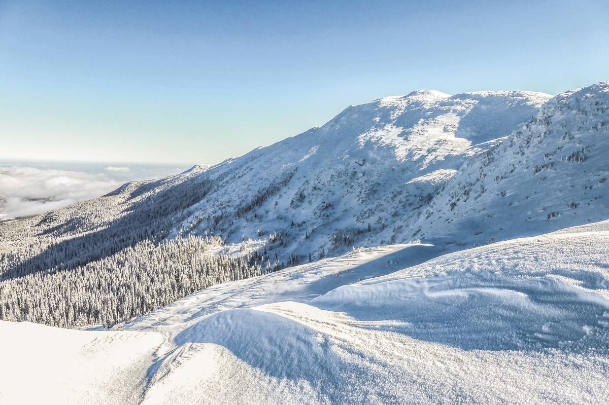 Zdjęcia ilustrujące zimową wyprawę na Babią Górę. Odśnieżone szlaki, zapierające dech panoramy Tatr i malowniczo zasypane polany ukazują surowe piękno górskich krajobrazów. Autor zdjęć: Andrzej Otrębski.