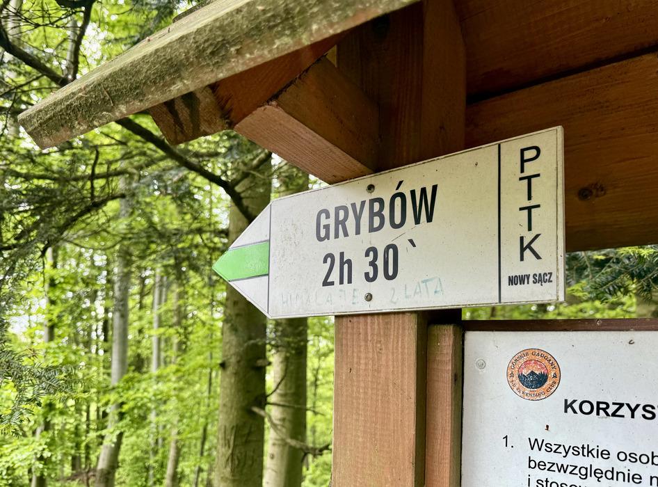 Szlakowskaz na g. Jaworze – początek szlaku zielonego do Grybowa, fot. Kacper Szymański