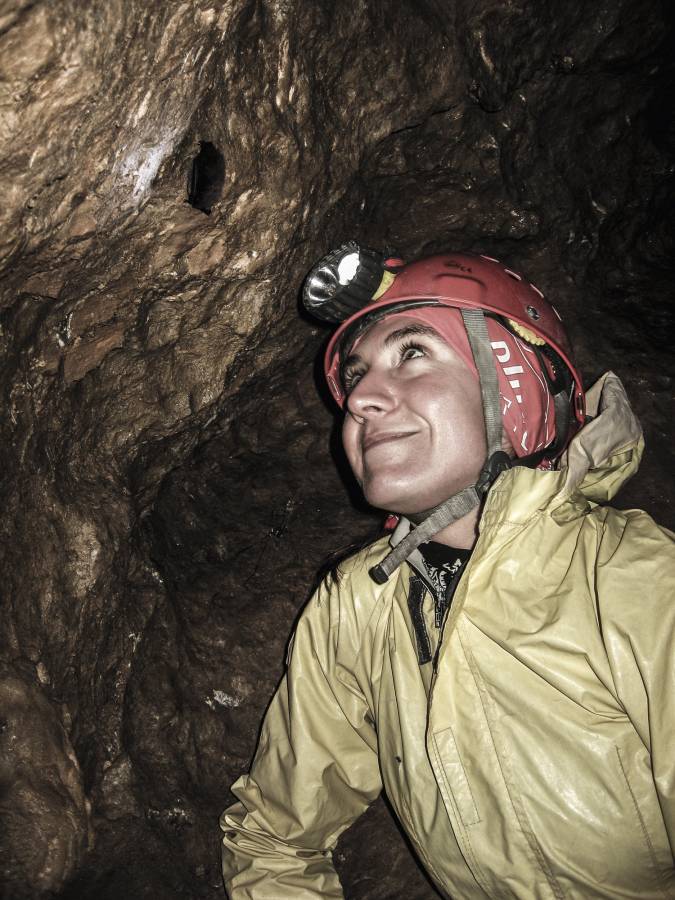 W Jaskini Kalackiej. W tle widoczny nietoperz – nocek wąsatek. Zdjęcie Kamil Uznański