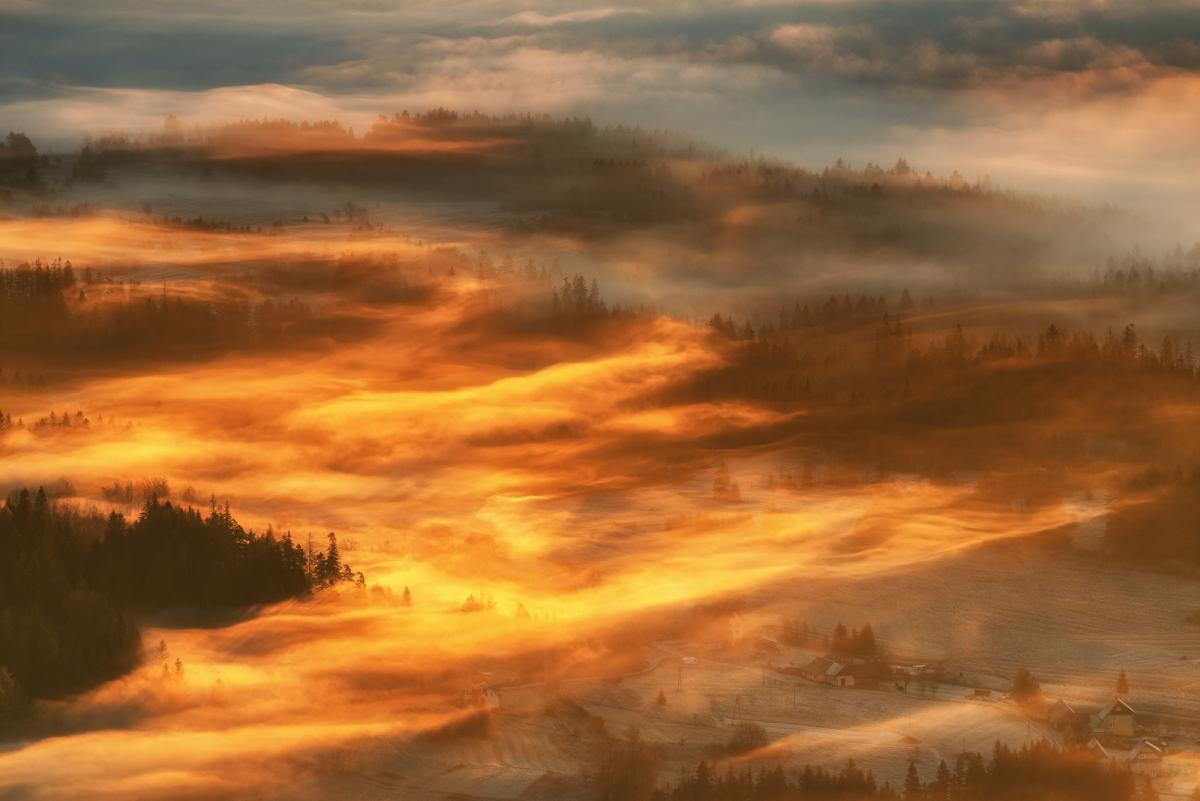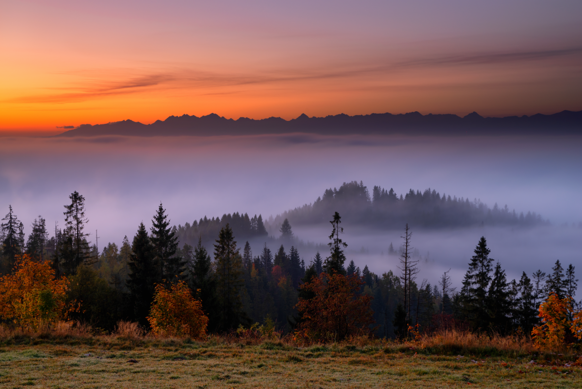 Krajobraz w pierwszych promieniach słońca widziany z Babiej Góry. Zdjęcie Michał Sośnicki
