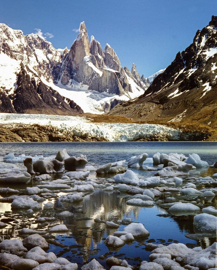 Patagonia, widok poprzez Lago Tore na szczyt Cerro Tore, który był celem wyprawy w 1986 r. Zdjęcie Michał Kochańczyk