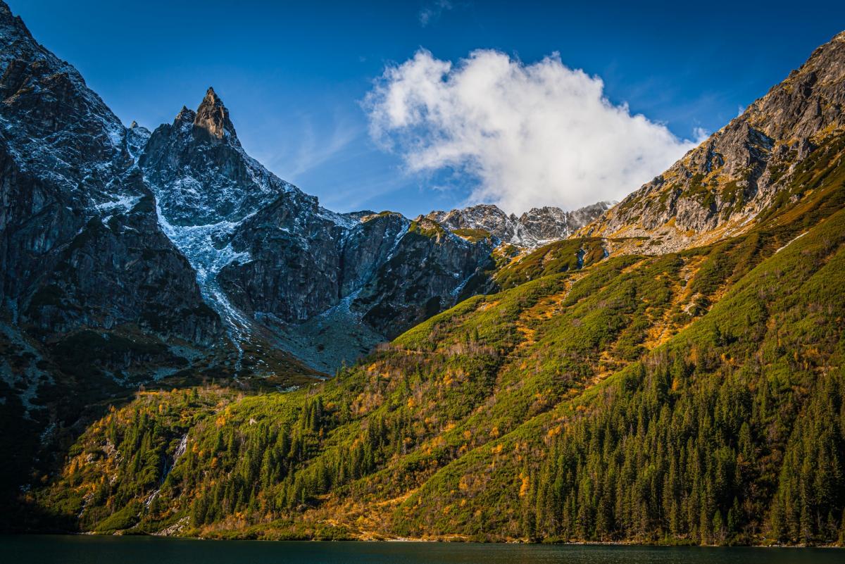 Charakterystyczny wierzchołek Mnicha wznosi się nad Morskim Okiem. Zdjęcie Adobe Stock