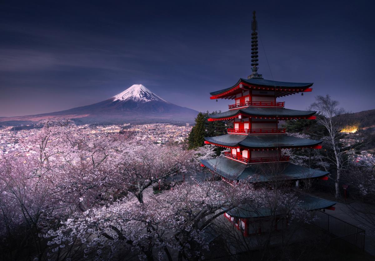 Galeria zdjęć prezentująca majestatyczny szczyt Góry Fuji. Zdjęcia ukazują wulkan pokryty śniegiem, otoczenie jezior oraz urokliwe miejsce w Fujiyoshida z widokiem na piramidę góry. Fotografie przenoszą widza w magiczny świat japońskiej przyrody i kultury, pokazując dlaczego Fuji jest tak wyjątkowym miejscem dla mieszkańców oraz turystów.