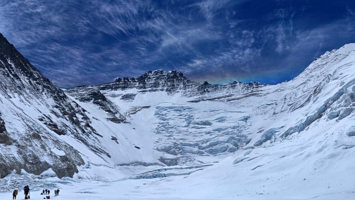 Widok z C4 Lhotse w kierunku przełęczy południowej i szczyt Everest