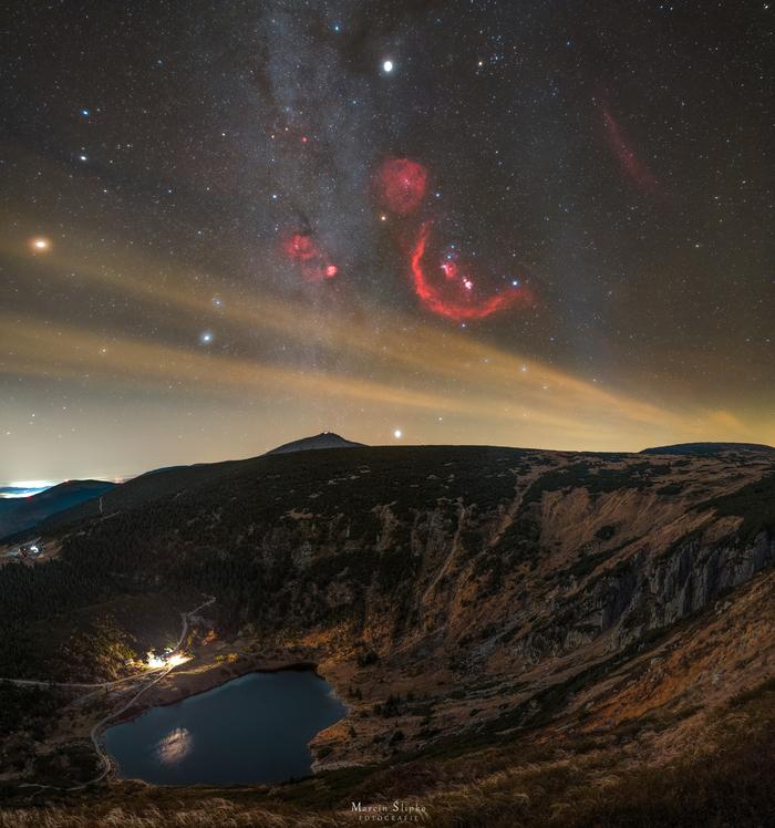 Orion nad Samotnią – Karkonosze Wschodzący gwiazdozbiór Oriona nad Śnieżką i Kotłem Małego Stawu. Listopad 2024 r. Fot. Marcin Ślipko