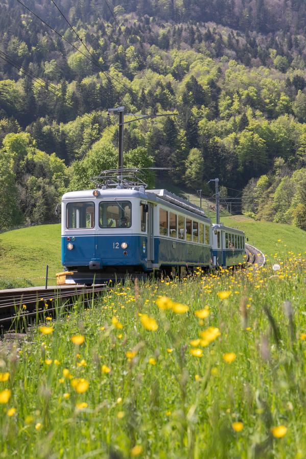 Niebieski pociąg kolei zębatej z Rigi zbliża się do stacji Kräbel na północnej linii z Goldau. Fot. Julia Zabrodzka