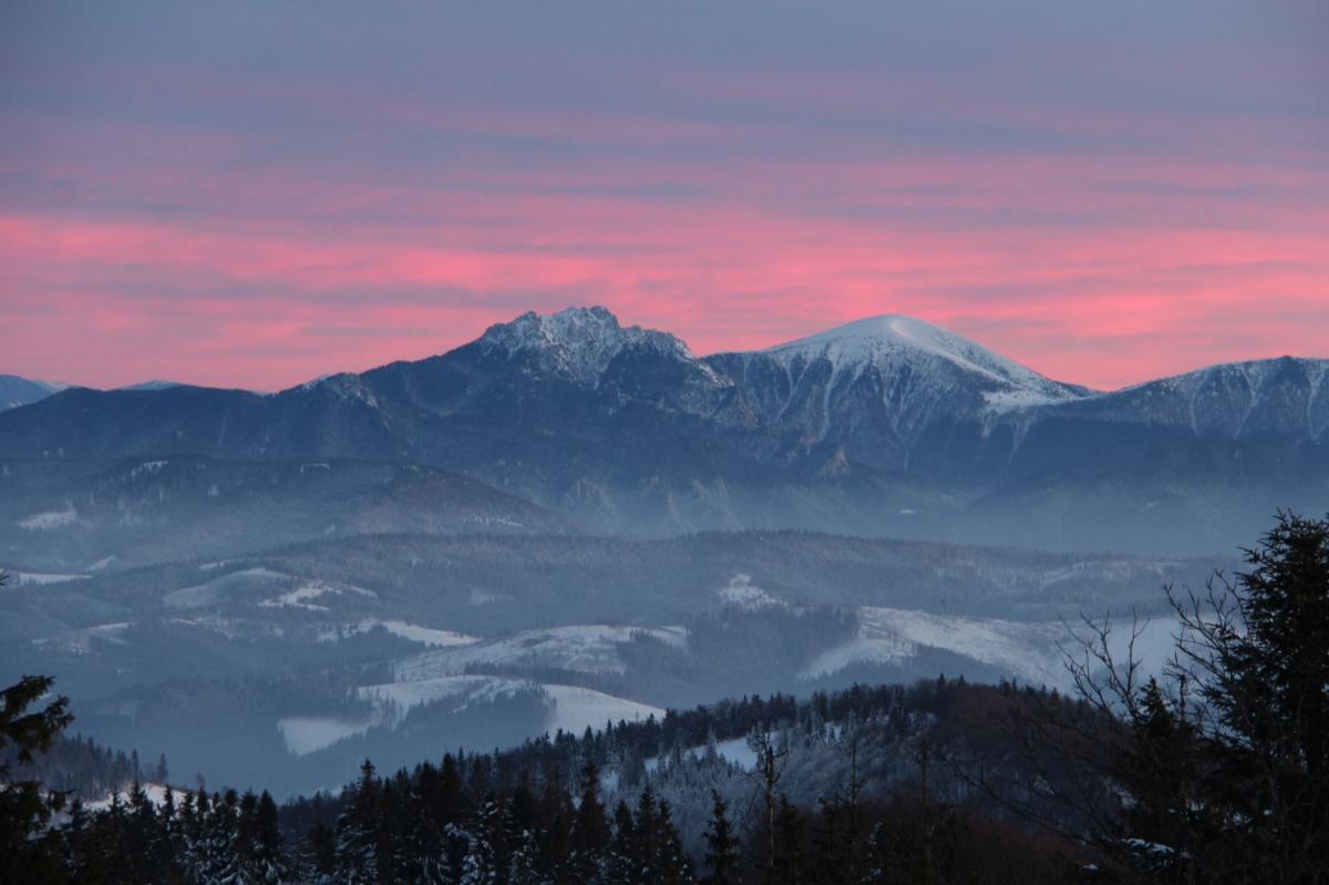 Ze szczytu można podziwiać okazałą panoramę. Na horyzoncie widać charakterystyczny Velky Rozsutec, łagodny stożek Stoha, Pilsko i Babią Górę. Jest też skalisty szczyt Wielkiego Chocza i bardziej odległy Chopok. Zdjęcie Paulina Grzesiok