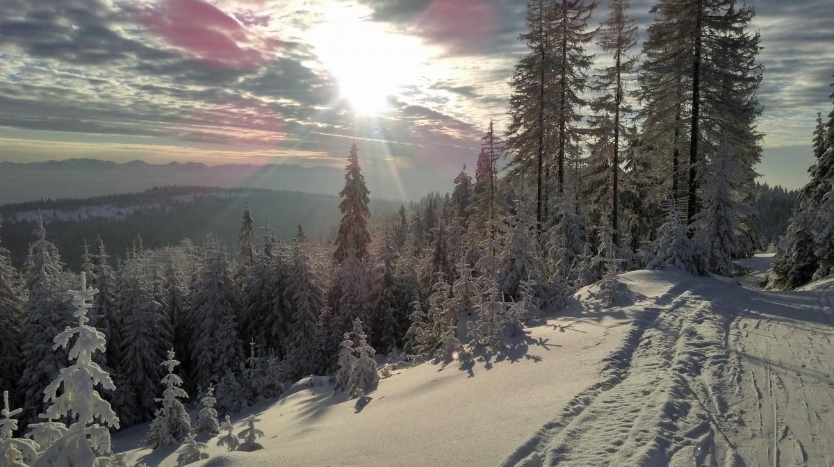 Zimowa trasa biegowa Obidowa–Turbacz w Gorcach: ślad ratraka, leśne podejścia, panoramy Beskidu Wyspowego i Tatr oraz schronisko na Turbaczu w zimowej scenerii.