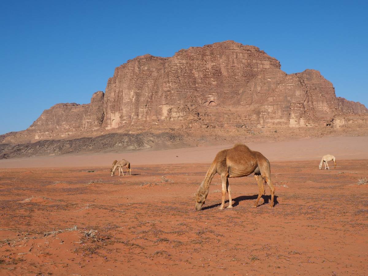Wielbłądy wyjadają małe fioletowe kwiatki, które wyrosły po deszczach, zdjęcie Kamila Gruszka