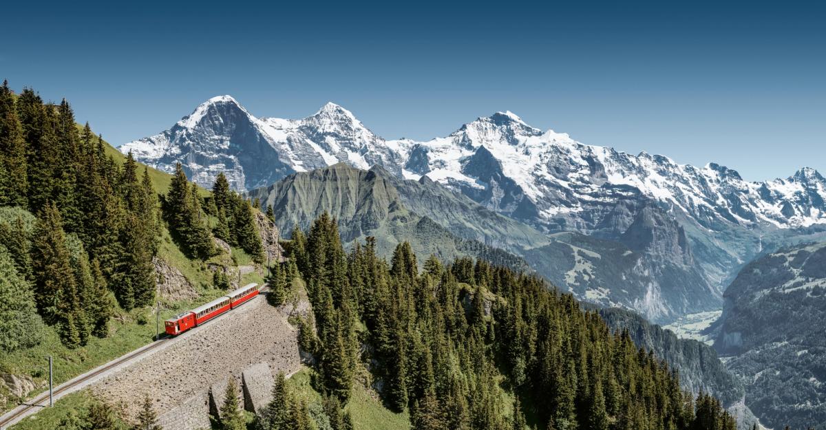 Kolejka zębata Schynige Platte-Bahn, a na drugim planie Eiger, Mönch i Jungfrau. Zdjęcie Switzerland Tourism