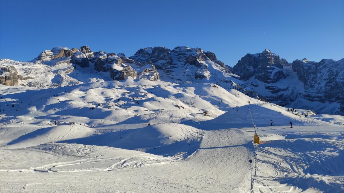Widok na Dolomity Brenty (z prawej strony z Passo del Grostè) ze zjazdu z Monte Vigo w stronę Madonny di Campiglio. Zdjęcie Anna Kłos